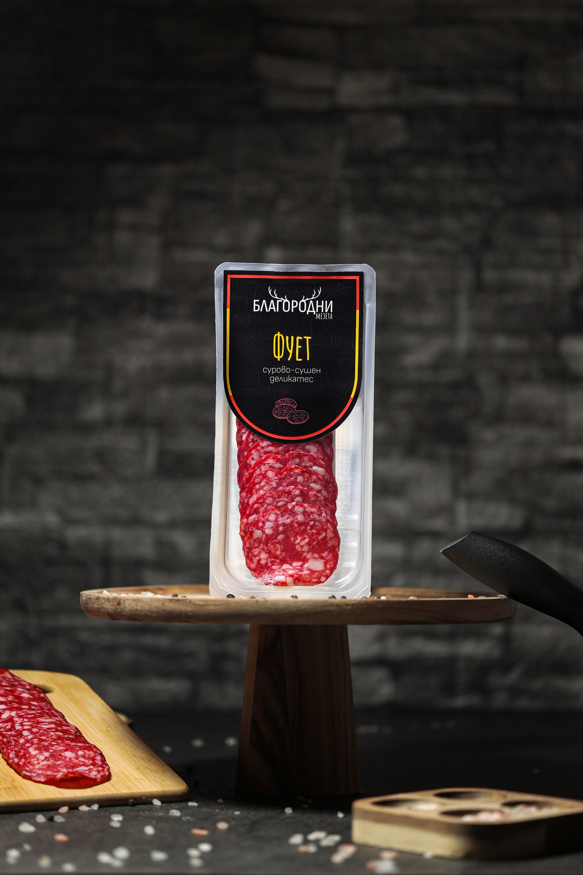 Фует „Благородни мезета“ е деликатес, вдъхновен от испанската традиция и поднесен в премиум слайс формат. Тънката му форма осигурява равномерно сушене и по-мека текстура, а внимателно подбраните подправки допълват естествения вкус на месото. За разлика от по-пикантните испански салами, фуетът се отличава с по-нежен и фин вкус.
